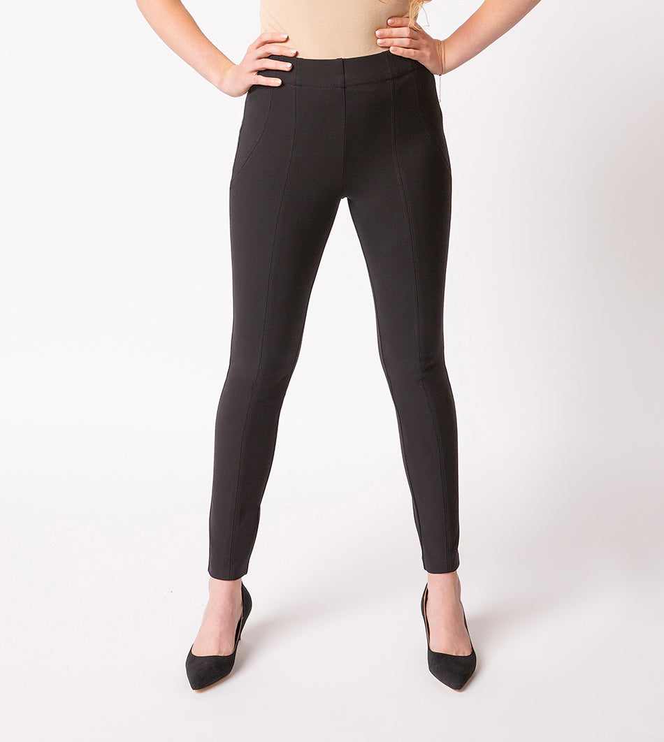 “This pant has a beautiful feel, sheen and fit. It is a practical pant that can be dressed up or down. If you have a little extra love in the waistline, these pants are forgiving. They taper the body to give a very slim look, but not a legging look. This is a true fashion staple. Perfect for travel. It can be used for multiple purposes, but definitely not a clean the house, or go work in the garden. A keeper.”